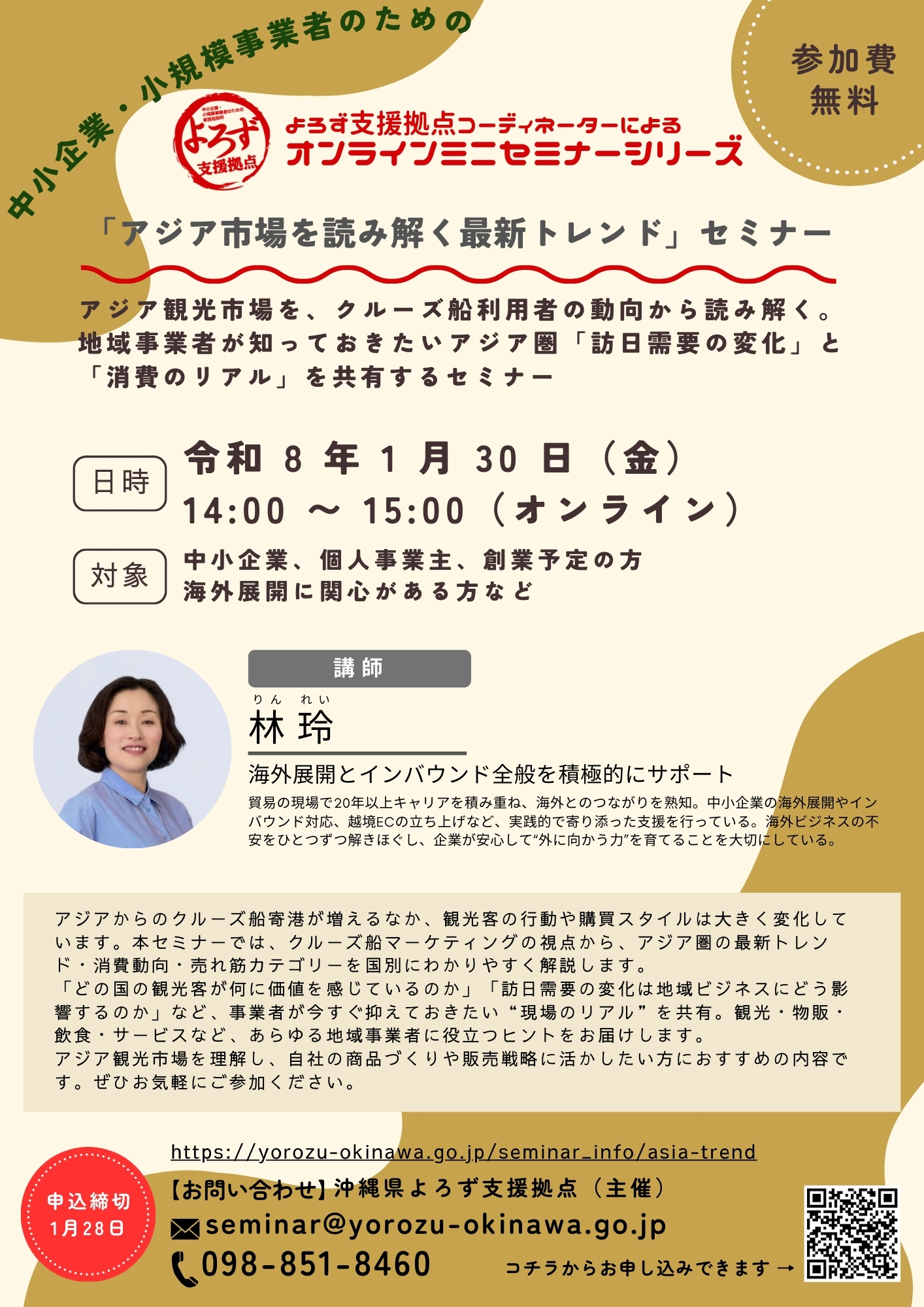 アジア観光市場を理解し、自社の商品づくりや販売戦略に活かしたい方におすすめの内容です。ぜひご参加ください。