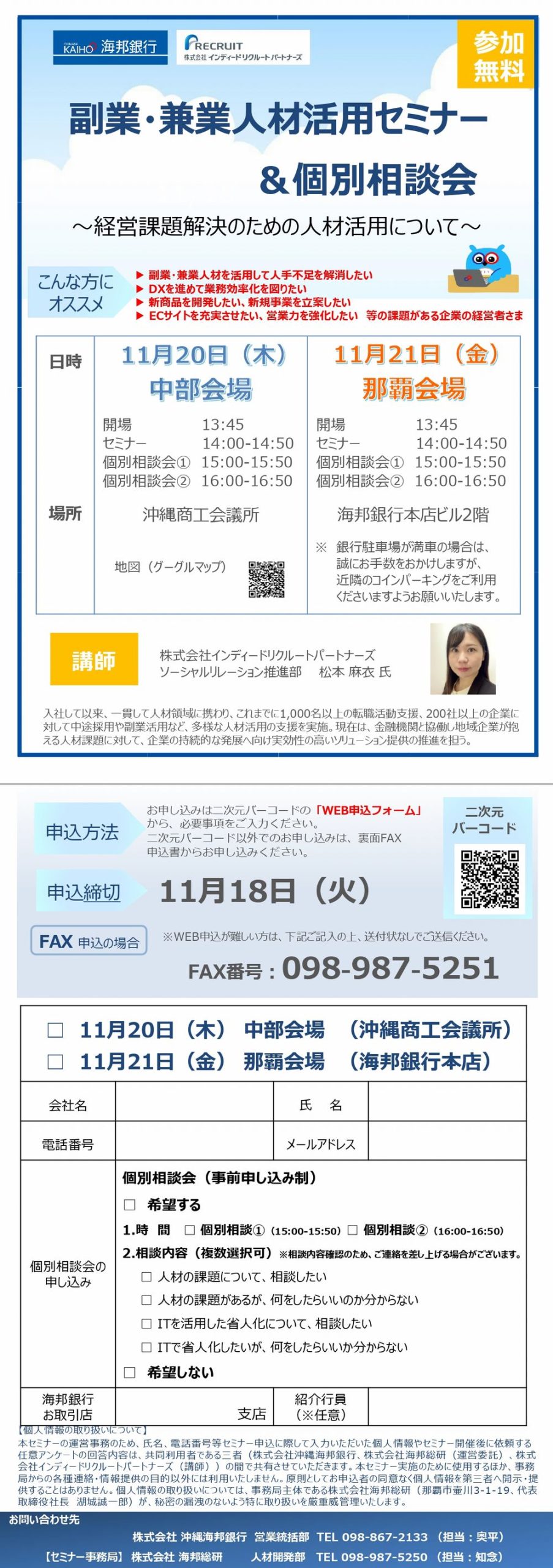 | 会 場 | 《中部》沖縄商工会議所(沖縄市中央 4-15-20) 《那覇》沖縄海邦銀行 本店ビル 2F(那覇市久茂地 2-9-12) |
