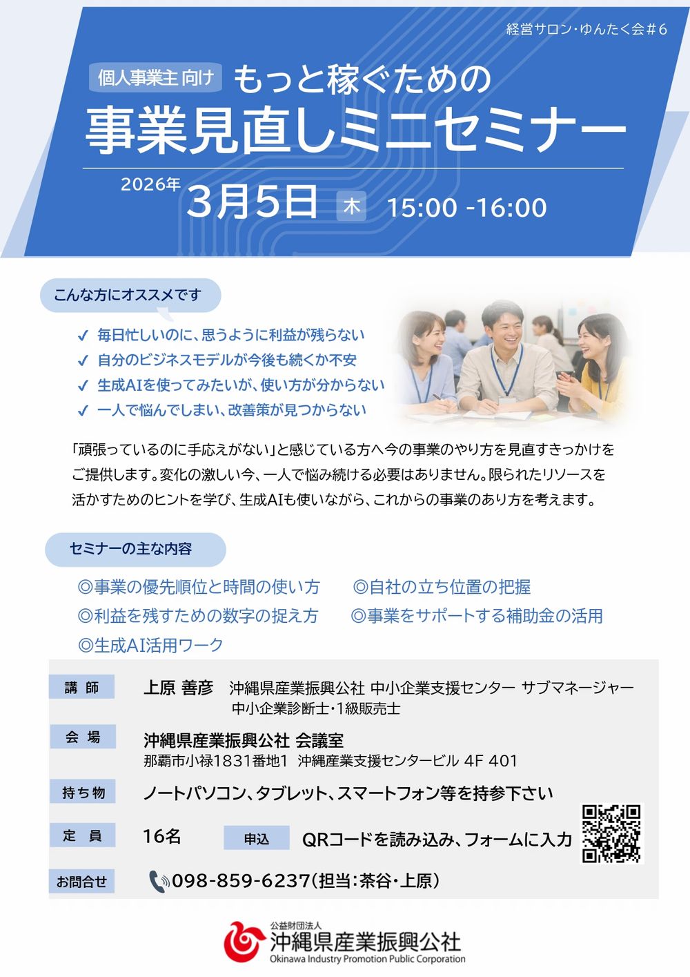 第 6 回経営サロン・ゆんたく会は、個人事業主向け「もっと稼ぐための事業見直しミニセミナー」です。